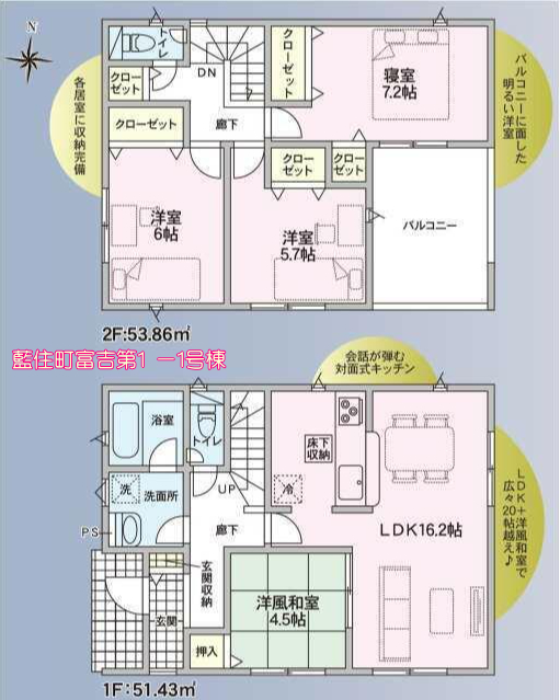 | 特色 | 浴室暖房、浴室乾燥機、3口以上コンロ、3口コンロ、バルコニー、トイレ2ヶ所、クローゼット、側溝、IHクッキングヒーター、カウンターキッチン、システムキッチン、浄水器、床下収納、人感センサー付照明、複層ガラス、浄化槽、テレビモニターホン、ディンプルキー、防犯カメラ、火災警報器(報知器)、ルーフバルコニー、駐車場、公営水道、接道5m、新規分譲地、電気温水器、温水洗浄暖房便座 | ||