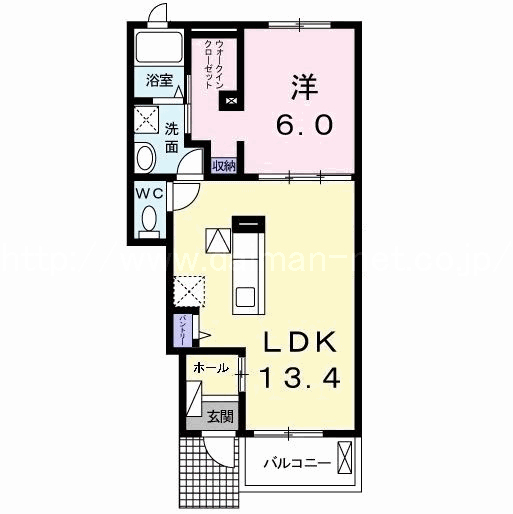 間取 | 1LDK | 間取詳細 | LDK13.4、洋6 |
