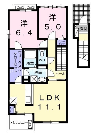 間取 | 2LDK | 間取詳細 | LDK11.1、洋6.4、洋5 |